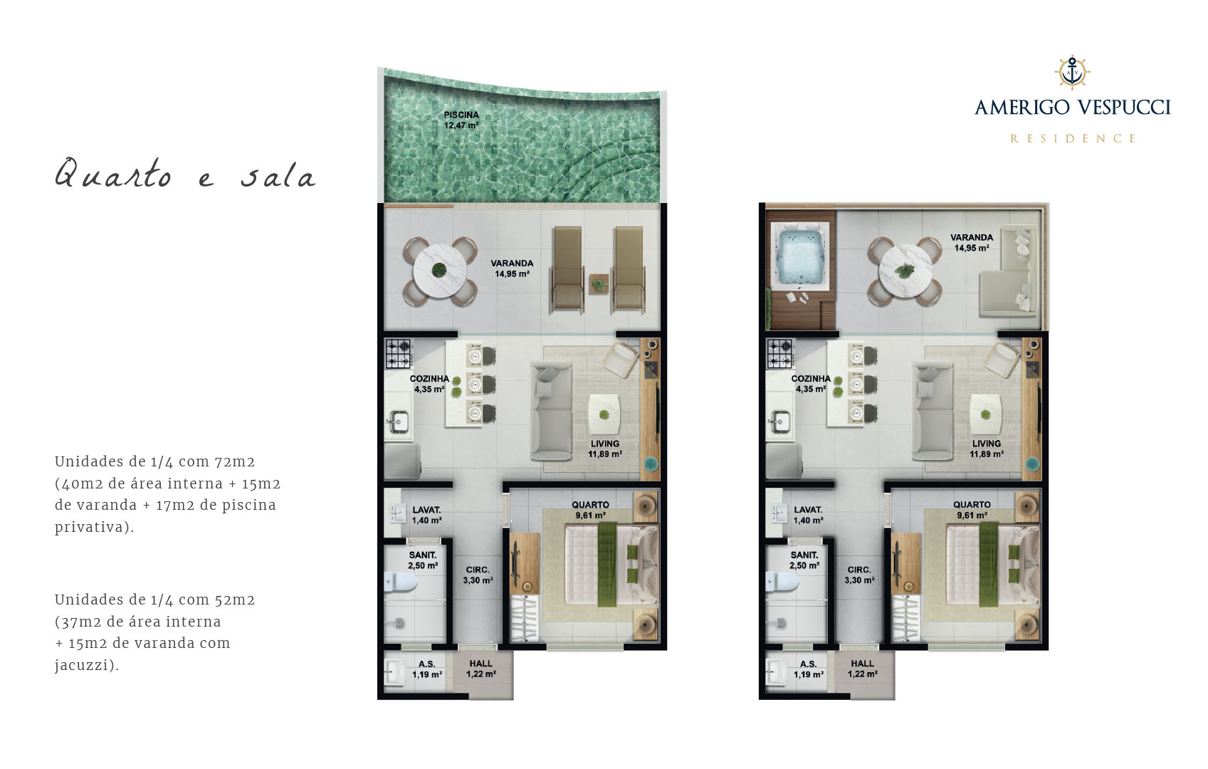 - 12 unidades de 1 quarto com 52m² (37m² de área interna + 15m² de varanda com jacuzzi).