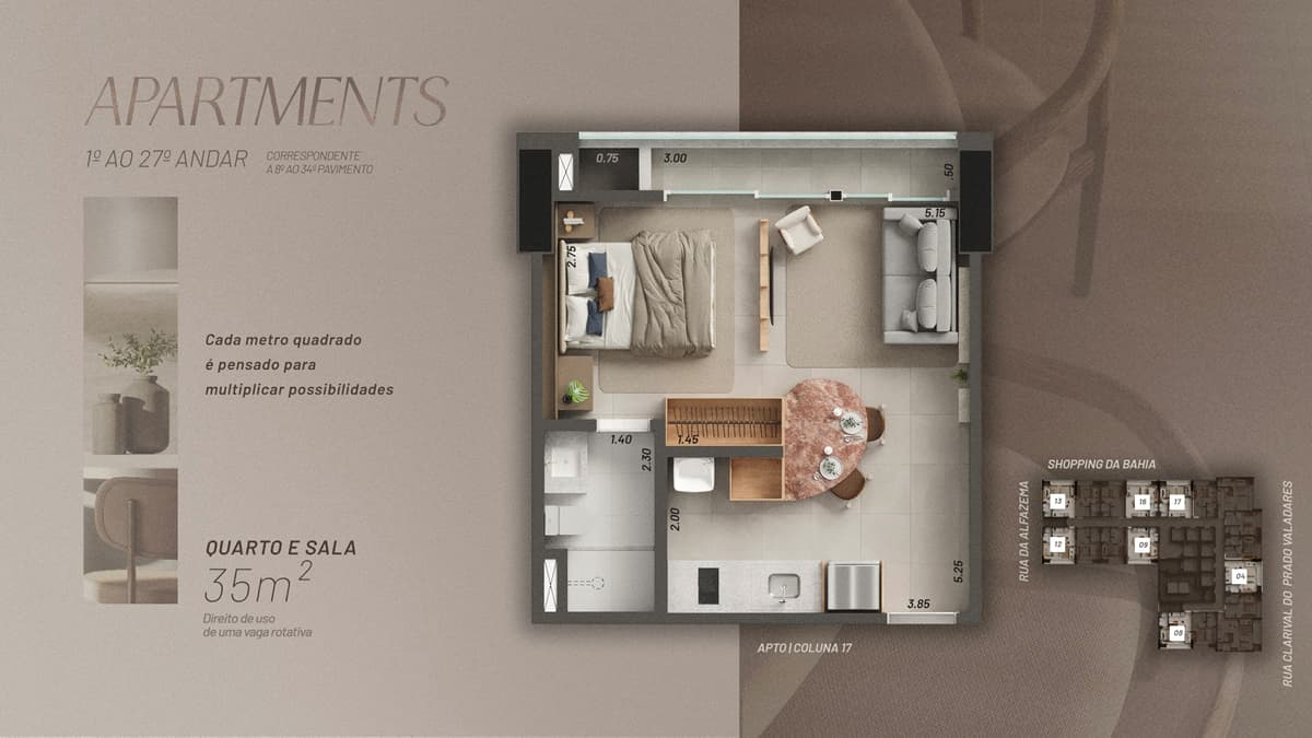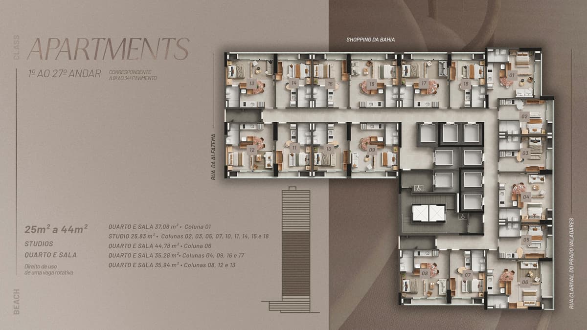 Os apartamentos do Beach Class Bahia apresentam plantas inteligentes e ótimo aproveitamento dos ambientes. Os studios possuem metragens a partir de 25 m², então atendem quem busca renda com locação ou uso prático. As unidades de quarto e sala variam entre 35 m² e 44 m², oferecendo mais conforto no dia a dia. Já os apartamentos de 2 quartos contam com 61 m², pois foram planejados para famílias ou investidores mais exigentes. Todas as unidades possuem direito de uso de uma vaga rotativa, o que amplia a conveniência.