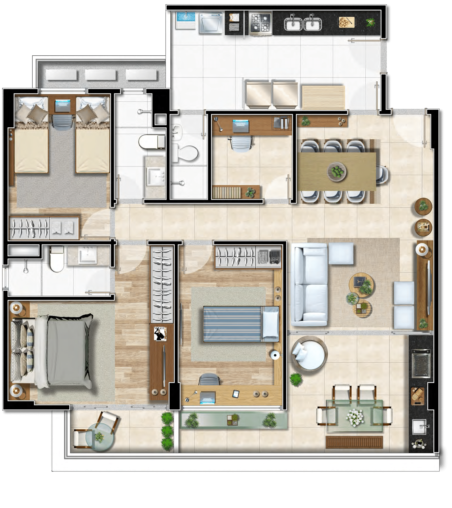 O Bellagio Caminho das Árvores apresenta unidades cuidadosamente projetadas, incluindo opções de 3 quartos com 1 suíte e home office, totalizando 108,80m² privativos. Cada apartamento foi desenhado para maximizar o conforto e a funcionalidade, garantindo um lar sofisticado e acolhedor.