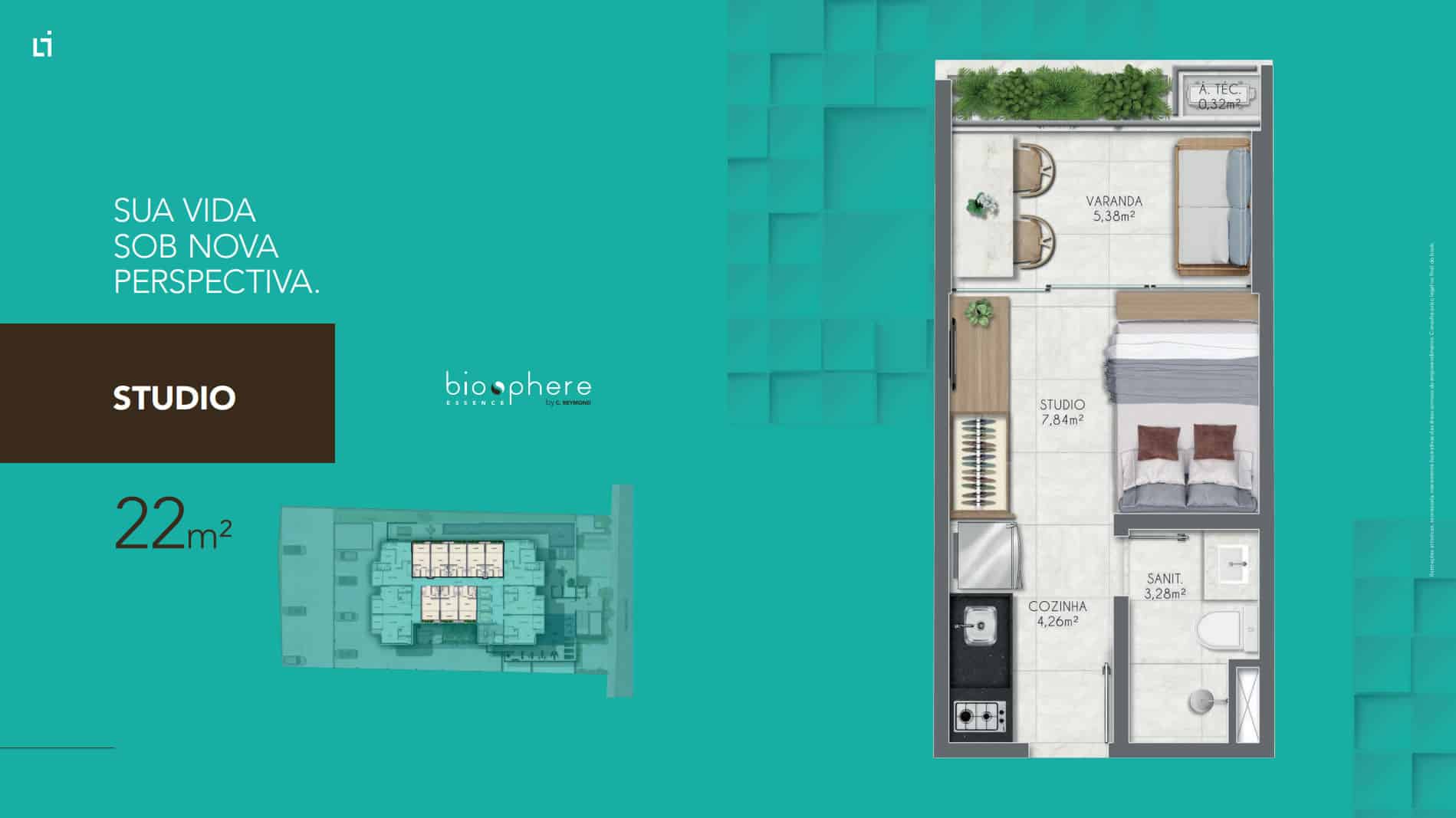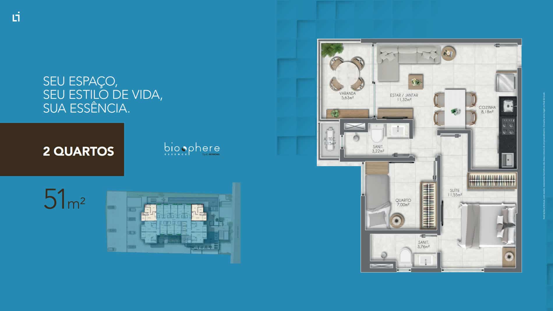O Biosphere Essence combina espaços residenciais de alta qualidade (Studio 22,58m², 1 Quarto 35,95m², 2 Quartos 51,80m²) com comodidades modernas como piscina semiolímpica, fitness center, gourmet, coworking, e muito mais.