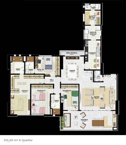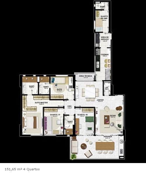 Planta baixa 151,65m2, 4 quartos – tipo 2
