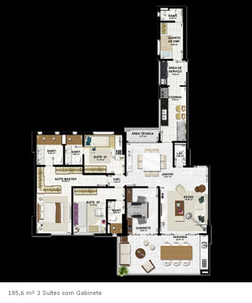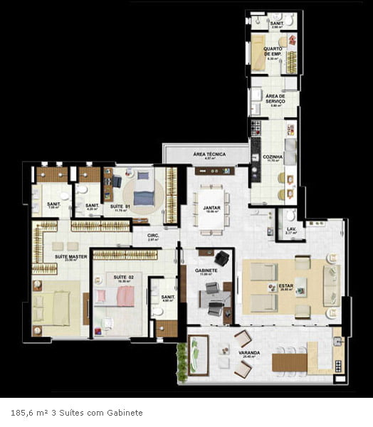 Planta baixa 185,6m2, 3 suítes com gabinete
