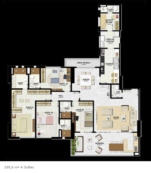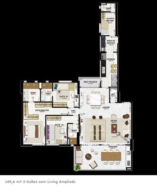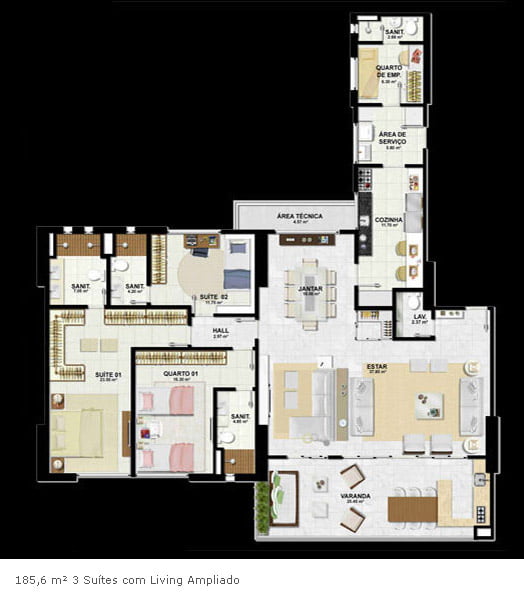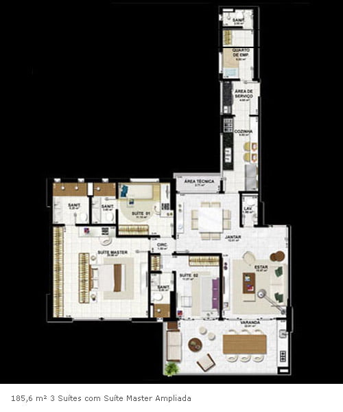 Planta baixa 185,6m2, 3 suítes com living ampliado