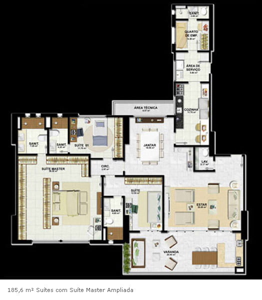 Planta baixa 185,6m2, 3 suítes com suíte master ampliada