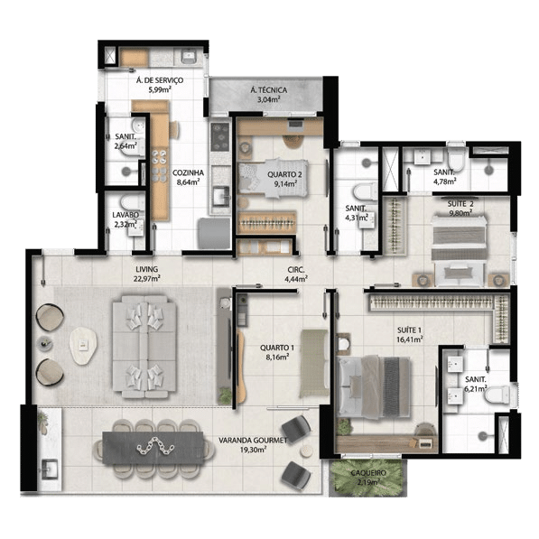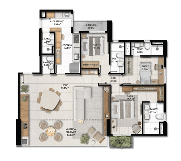 | 3 Suítes | Living Ampliado | 2 | 130m² |