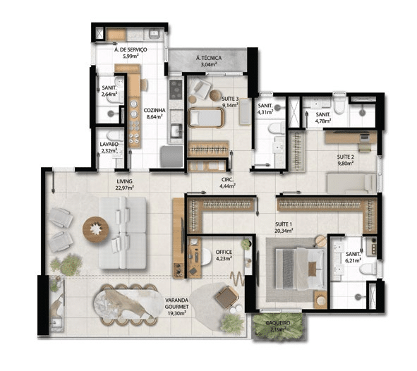 | 3 Suítes | Suíte Master Ampliada e Office | 2 | 130m² |