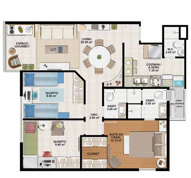 Áreas comuns entregues mobiliadas, decoradas e equipadas sem custo adicional.