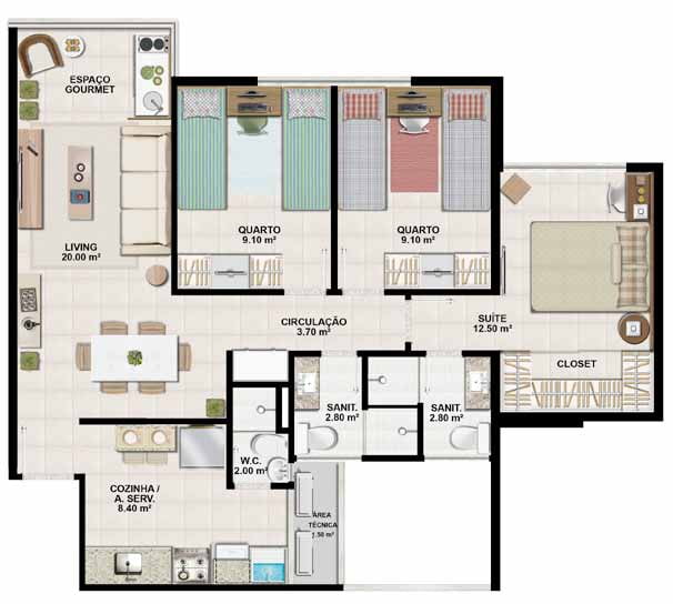 3 quartos (finais 01, 04, 05 e 08) | 3 | 1 | 1 | 70,00m² |