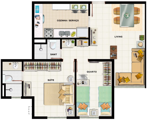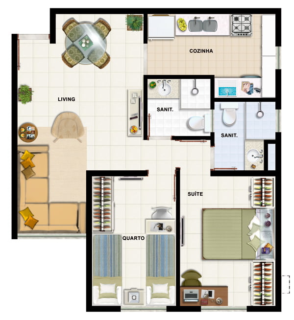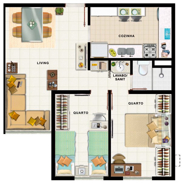 | 2 quartos | 2 | 0 | 1 | 46,00m² |