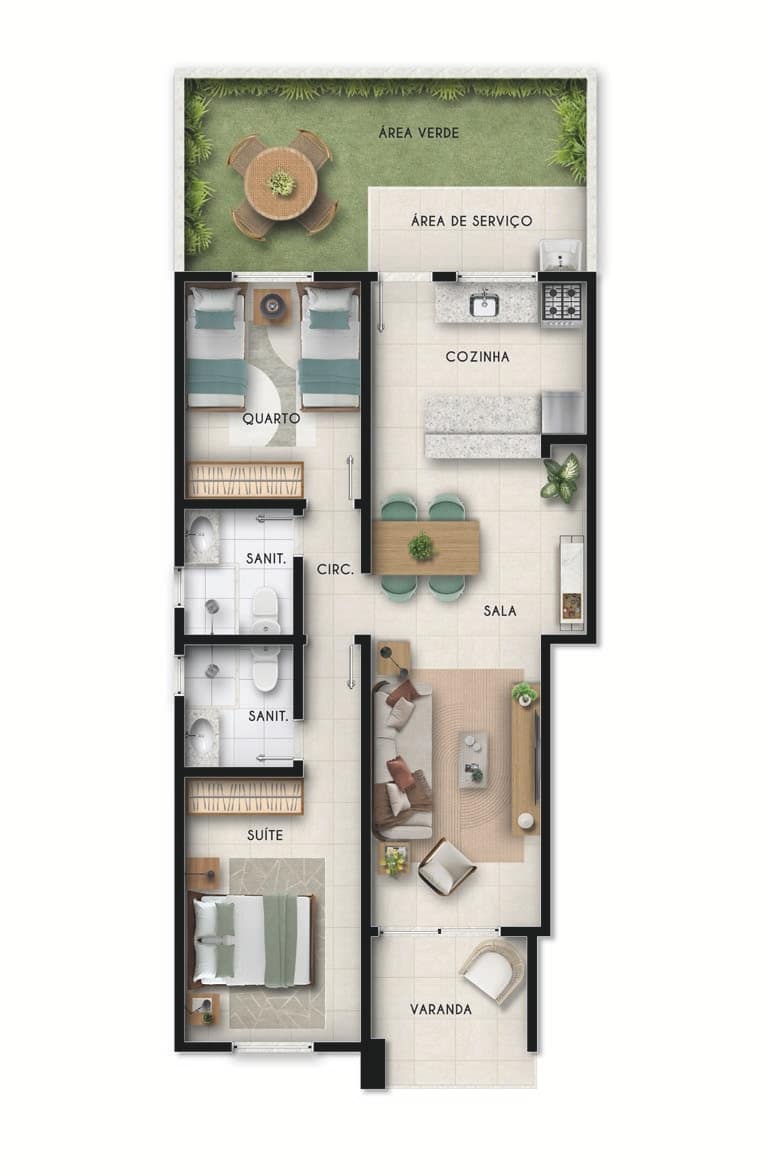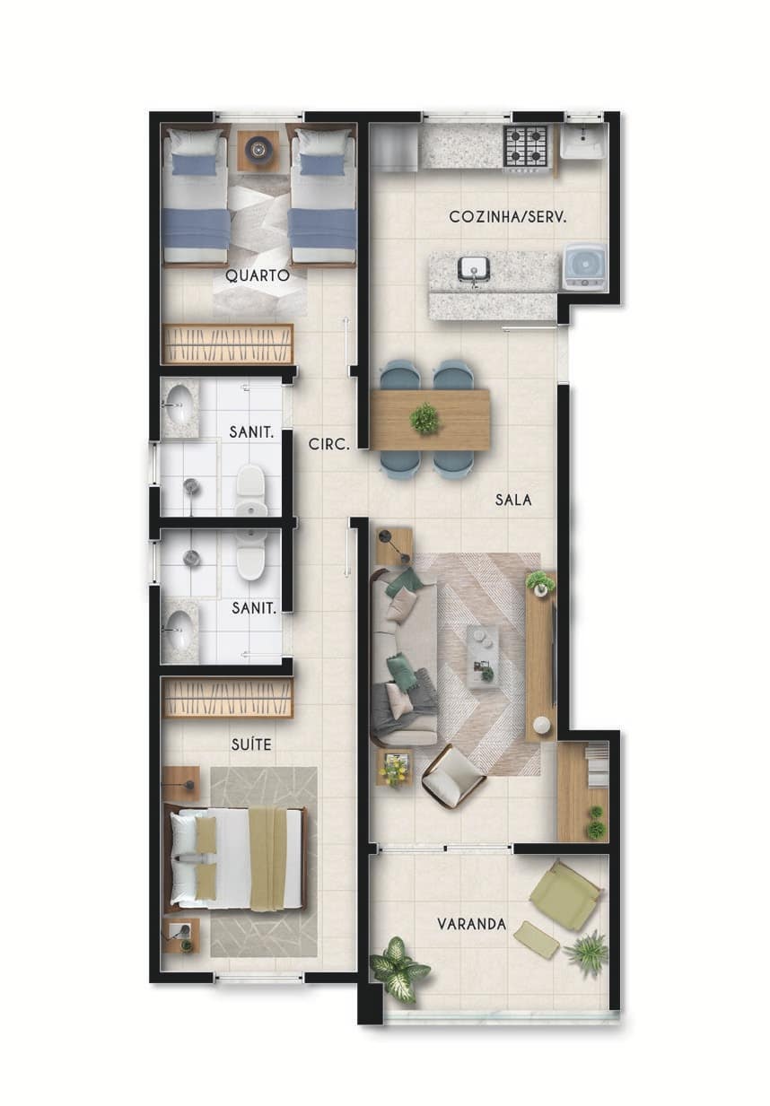 | 2 Quartos com Suíte | 2 | 1 | 68 m² |