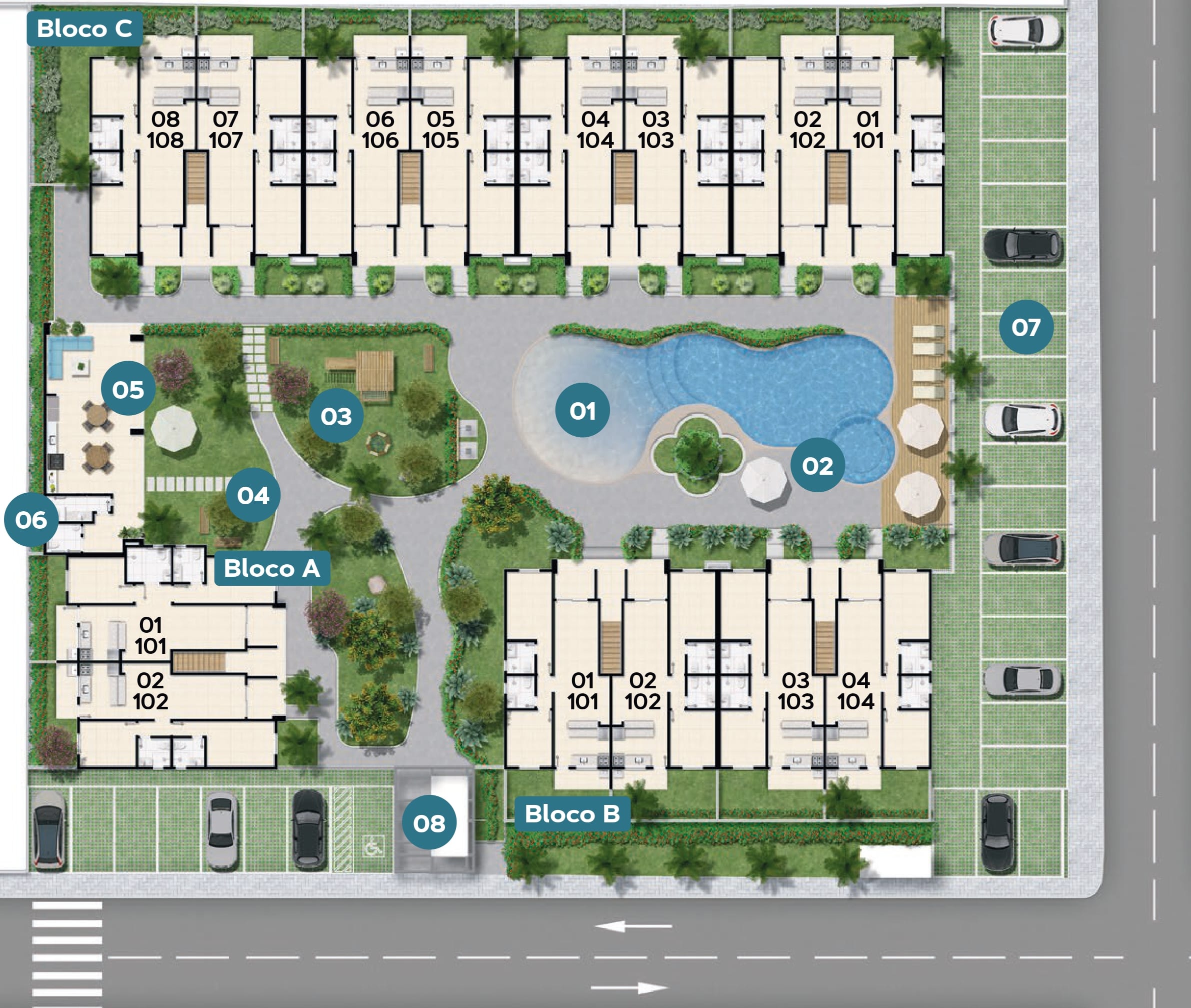 - Tipologia das Unidades: 2 quartos (com e sem quintal privativo);