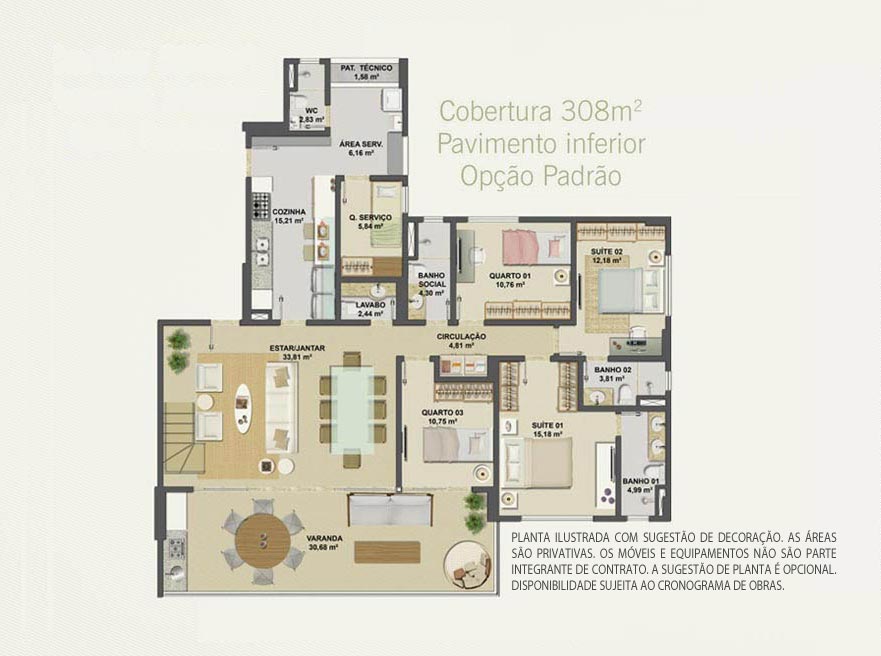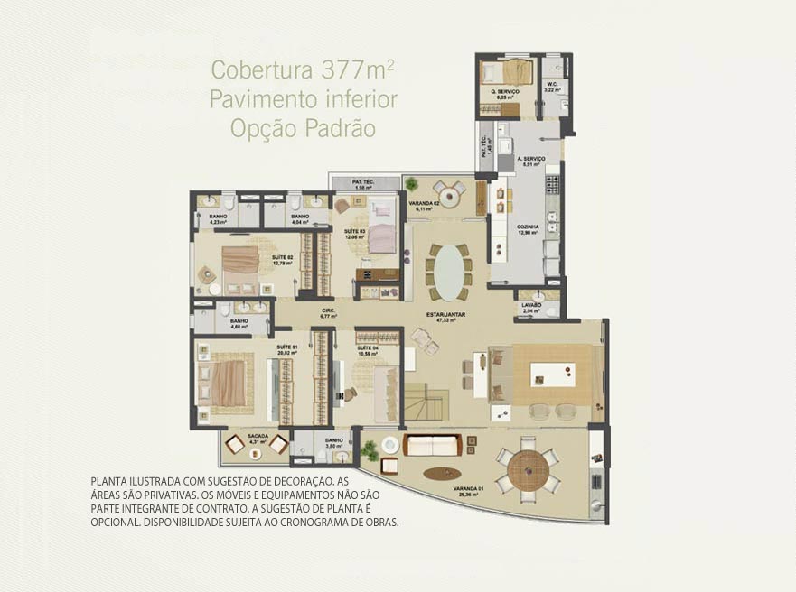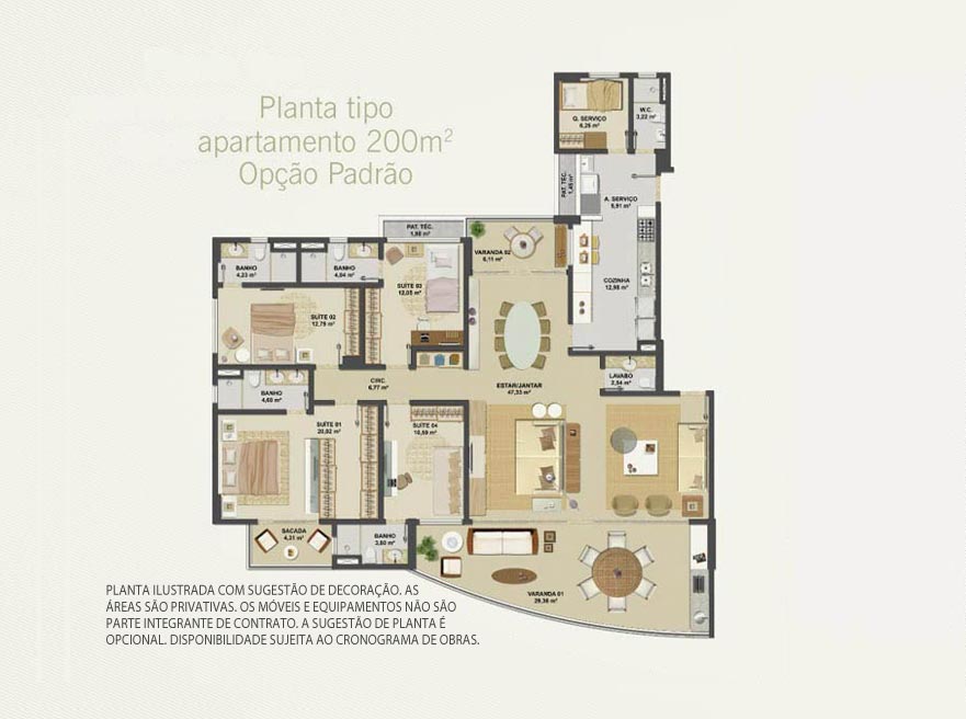 4 quartos, sendo 2 suítes, dependência na opção padrão