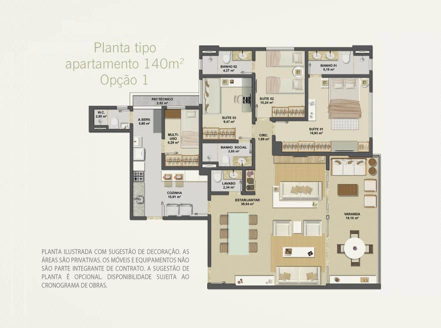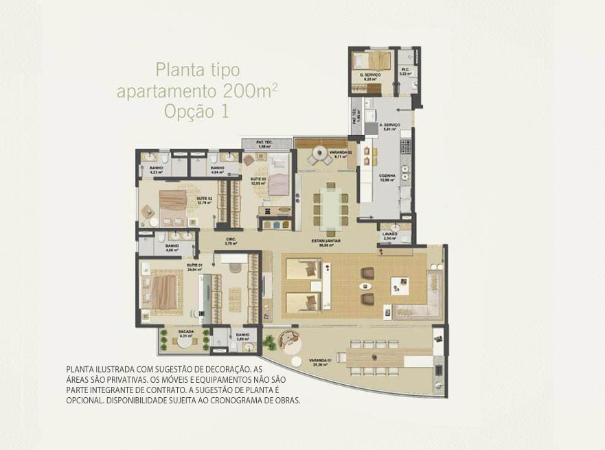 3 quartos, sendo 3 suítes com living ampliado e dependência na opção 01