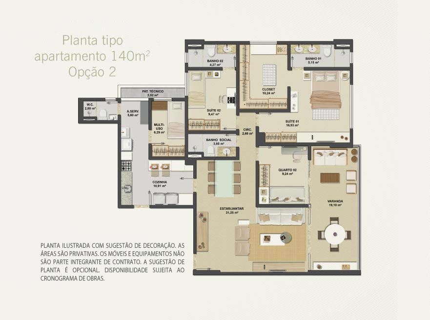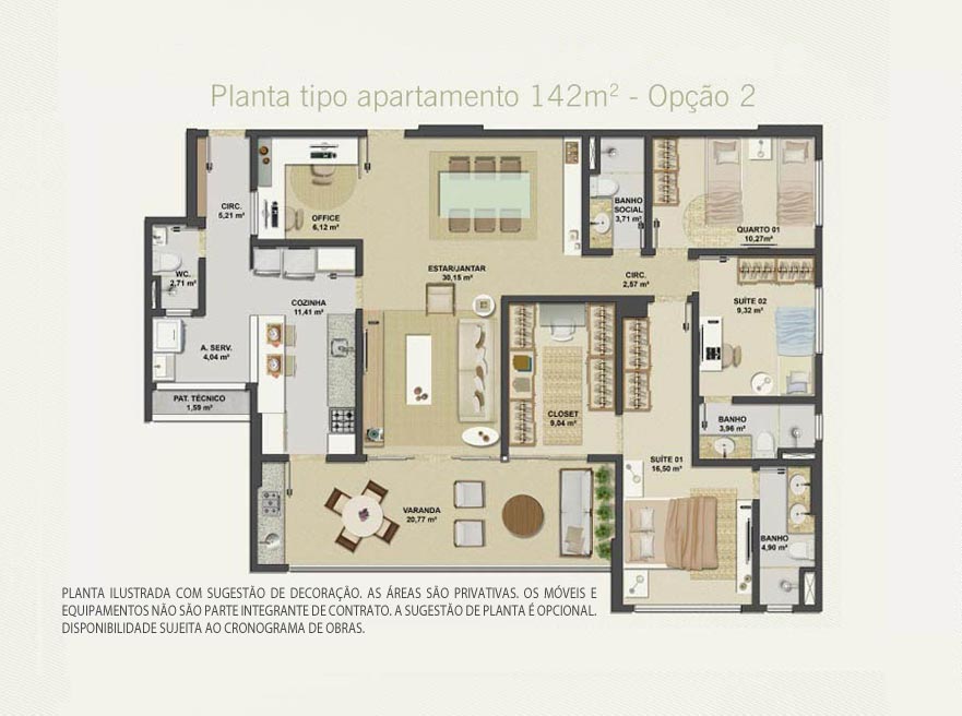 Apartamento 3 quartos, sendo 2 suítes, home office e closet na opção 02 – final 1 e 2.
