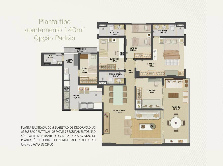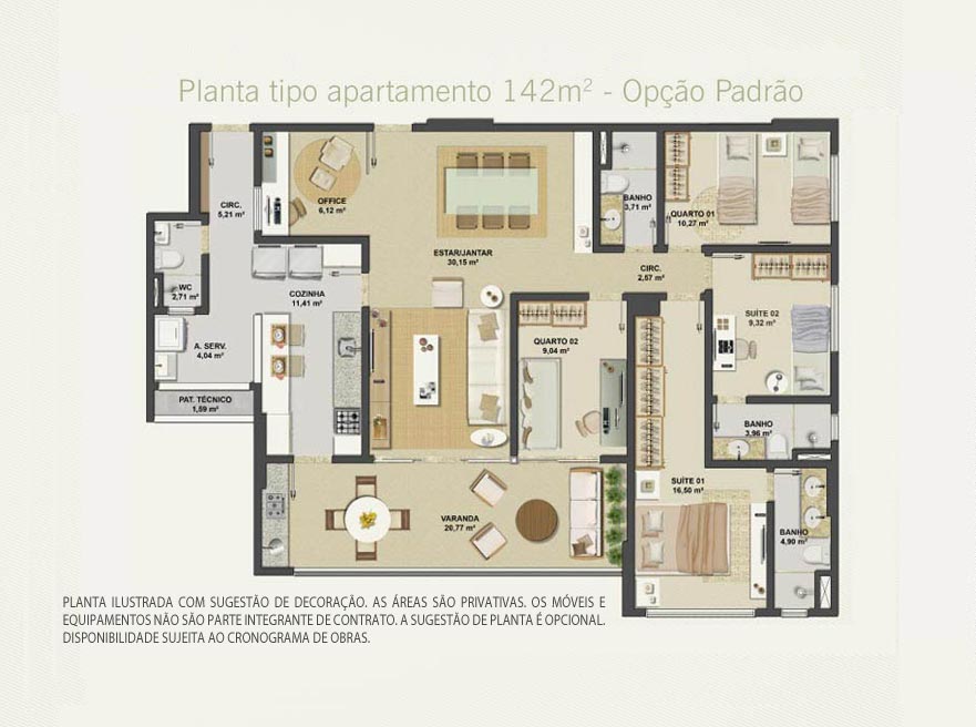 Apartamento 4 quartos, sendo 2 suítes na opção padrão – final 3 e 4.
