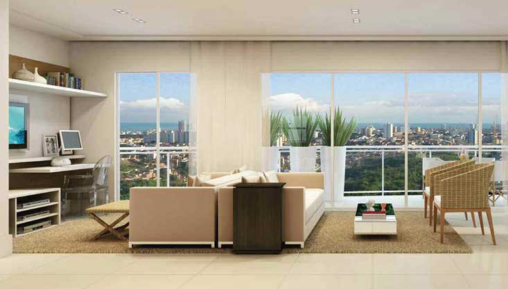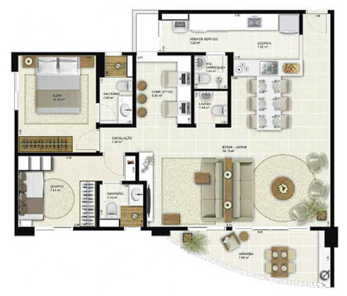- Opção B: 2 suítes, sala de estar/jantar ampliada, home office;