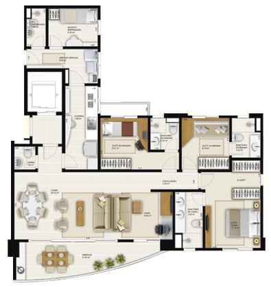 - Opção A: 3 quartos sendo 1 suíte, estar/jantar, lavabo, varanda, cozinha, área de serviço, dependência reversível e W.C Serviço;