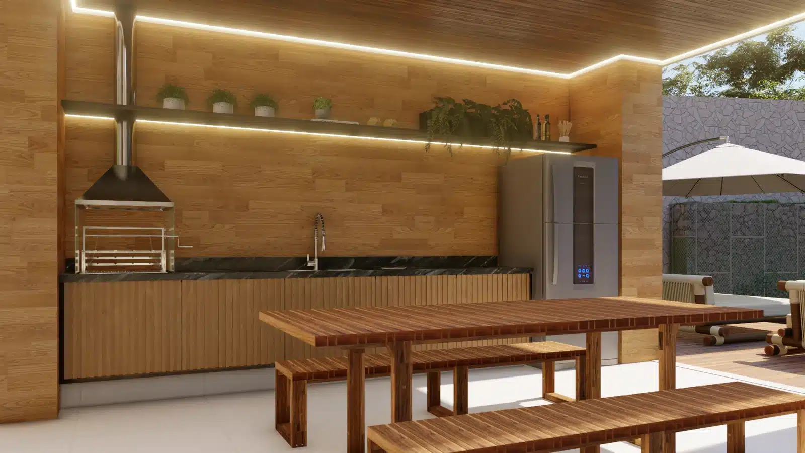 Espaço coberto com churrasqueira;