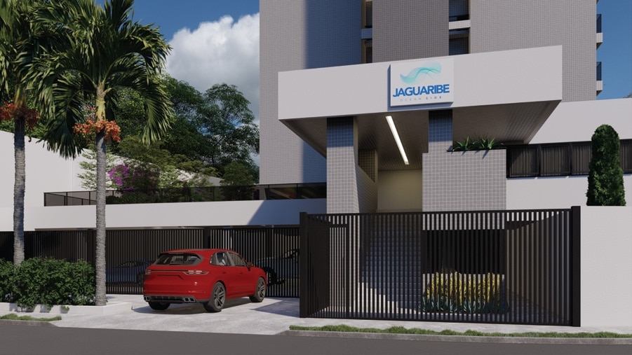 A entrada do Jaguaribe OCEAN SIDE convida você a um mundo de exclusividade e design, marcando o início de uma experiência de moradia de alto padrão.
