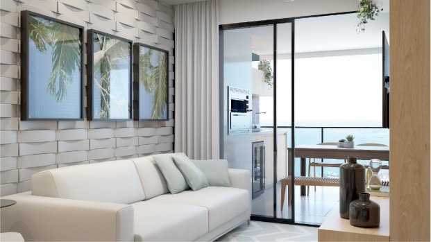 Desfrute de puro conforto e uma vista espetacular no elegante living do Jaguaribe OCEAN SIDE, onde cada detalhe é uma ode ao bom gosto.