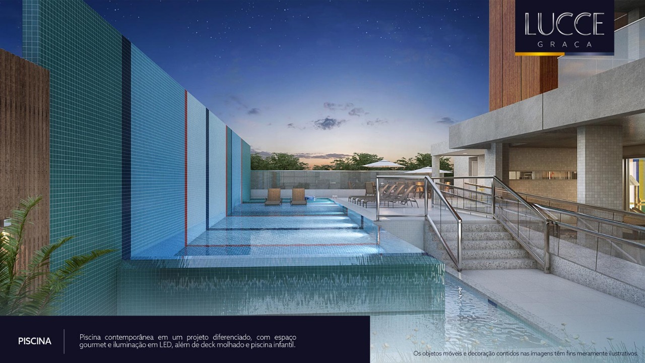 O Lucce Graça possui uma piscina única, contemporânea, incluída num projeto arquitetônico diferenciado, com espaço gourmet e iluminação em LED, além de deck molhado e piscina infantil.