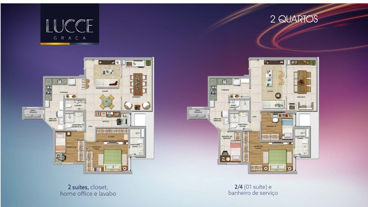 | 2 quartos, 2 suítes, closet, home office e lavabo | 2 | 2 | 2 | 86,17m² |
