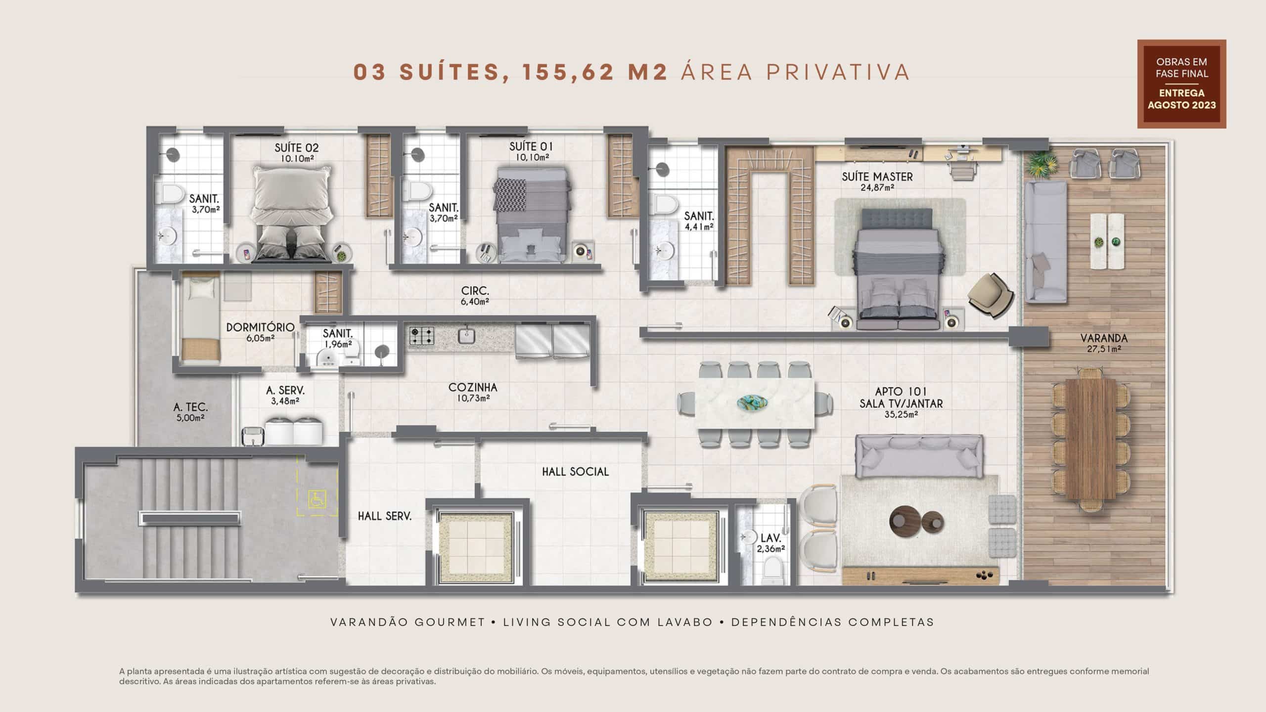 Cada apartamento na Mansão Carybé foi criado com a máxima atenção aos detalhes. Oferecemos unidades de 3 suítes com 155,62 m² de área privativa, projetadas para proporcionar o conforto que você merece. Eles incluem espaçosas salas de estar/jantar, varandas gourmet e dependências completas, adaptando-se perfeitamente ao seu estilo de vida sofisticado.
