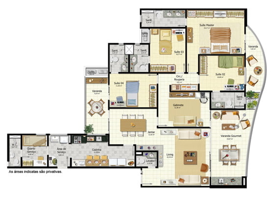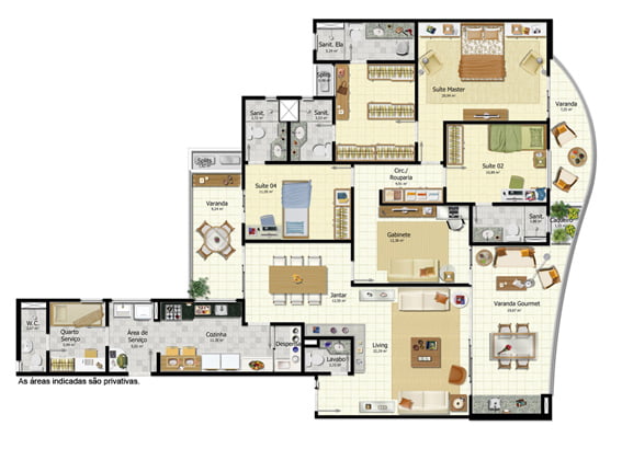 - 4 suítes com estar íntimo, com 189m² de área privativa, com opção para 4 suítes com gabinete ou 03 suítes com suíte master com closet e 02 banheiros.
