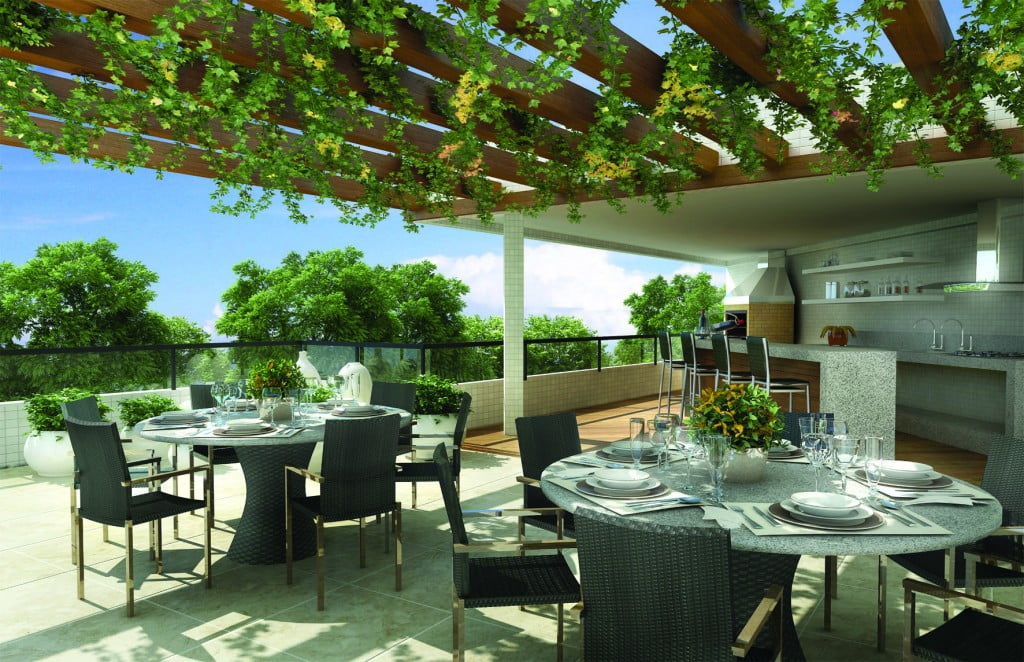 - hurrasqueira com espaço gourmet coberto por pergolado de madeira;