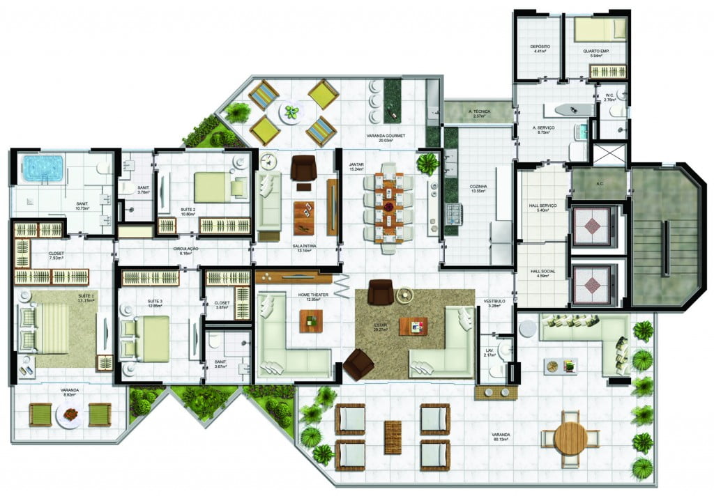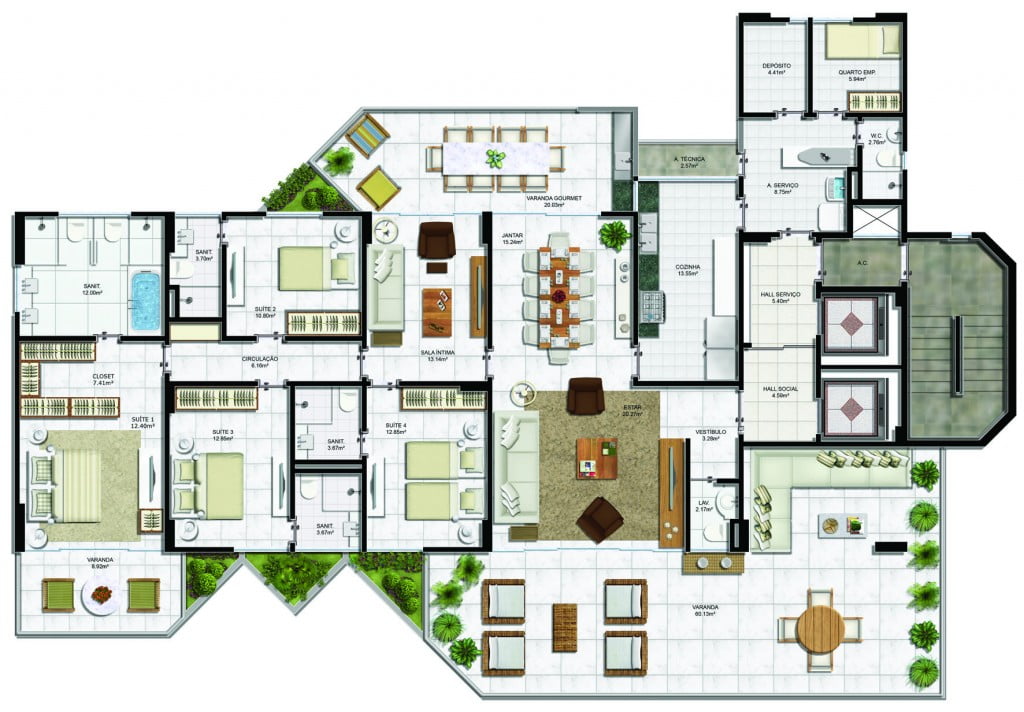 - Apartamento Tipo 4 suítes – 275,09m²;