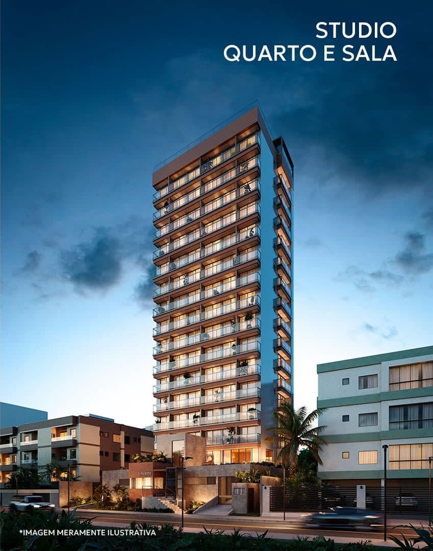 Fachada do Mirantte: arquitetura moderna e elegante no Costa Azul, com opções de Studios e Quarto e Sala.