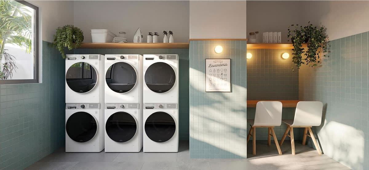 Lavanderia do Mirantte: espaço moderno e prático com máquinas de lavar e secar para uso compartilhado.