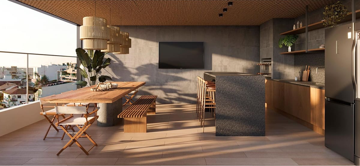 Espaço gourmet do Mirantte: ideal para receber amigos e familiares em um ambiente moderno, com vista e conforto.