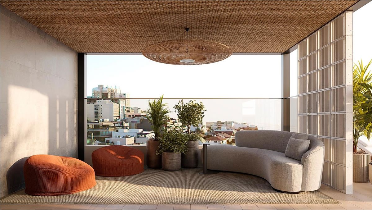 Lounge do Mirantte: espaço elegante e acolhedor para relaxar, com vista deslumbrante da cidade.