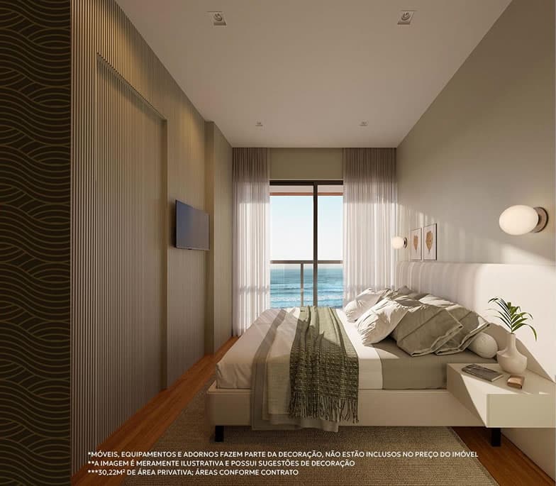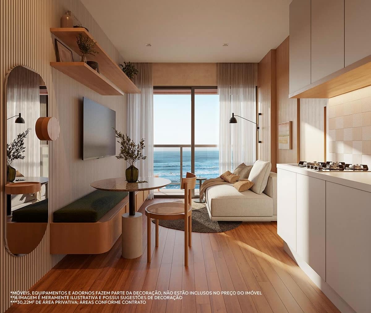 Quarto e Sala no Mirantte: ambiente integrado e moderno com uma vista espetacular para o mar.