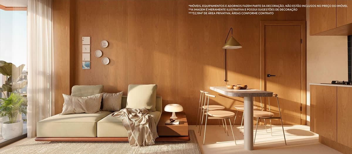 Apartamentos de 1 quarto com áreas que vão de 30,22 m² a 33,76 m². Essas unidades contam com varanda, sala de estar integrada e cozinha, proporcionando um ambiente otimizado e aconchegante.