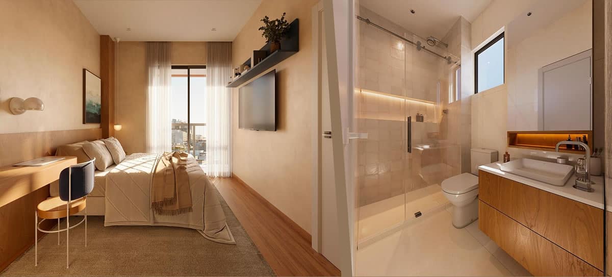 Quarto e banheiro do Mirantte: espaço planejado com design moderno, oferecendo conforto e praticidade.