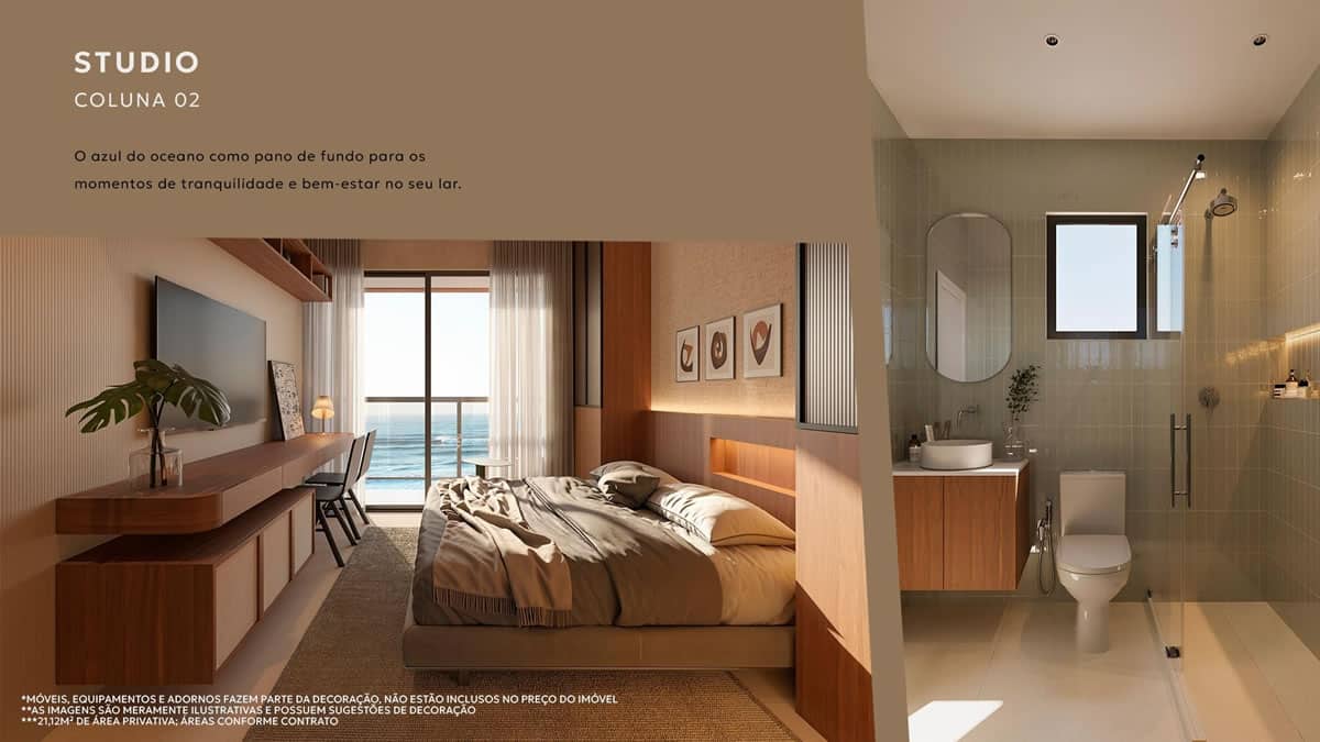 Studio Coluna 02 no Mirantte: desfrute de um espaço compacto e sofisticado com vista para o oceano.