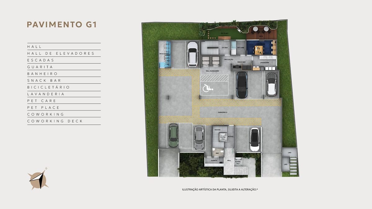 Planta baixa do Pavimento G1 do Mirantte: áreas comuns e vagas de garagem planejadas para o máximo de conveniência.
