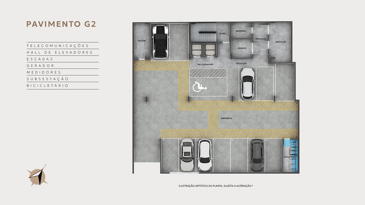 Planta baixa do Pavimento G2 do Mirantte: vagas de garagem e infraestrutura essencial, como gerador e subestação.