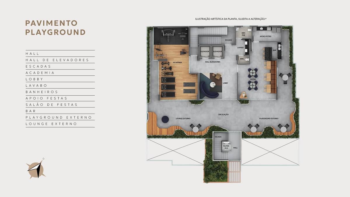 Planta baixa do Pavimento Playground do Mirantte: um espaço completo com academia, salão de festas, playground e áreas de lazer externas.
