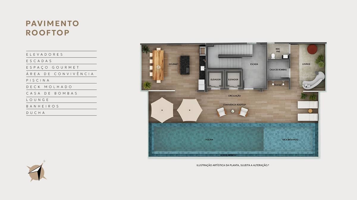 Planta baixa do Pavimento Rooftop do Mirantte: piscina com borda infinita, deck molhado e áreas gourmet e de convivência para relaxar com vista para o mar.