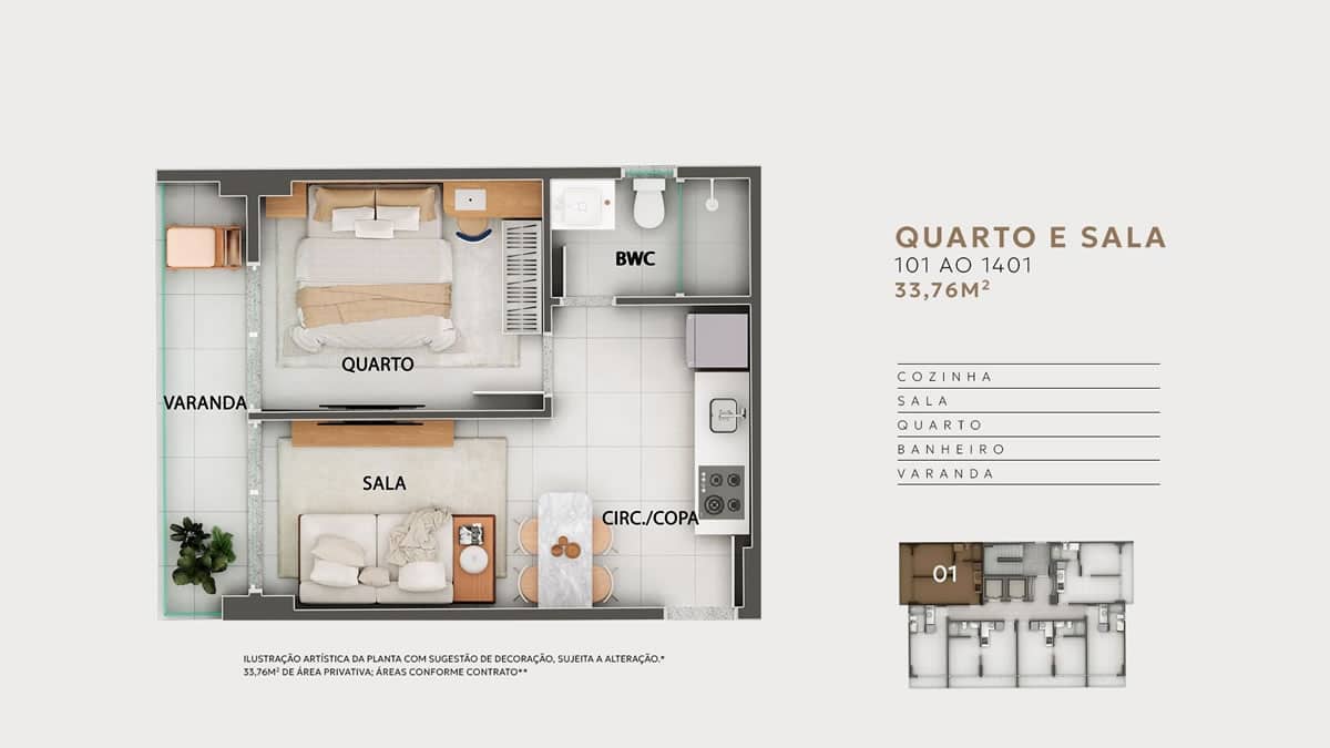 Planta do apartamento quarto e sala do Mirantte, com 33,76 m², mostrando a distribuição dos ambientes: quarto, sala, cozinha, banheiro e varanda.