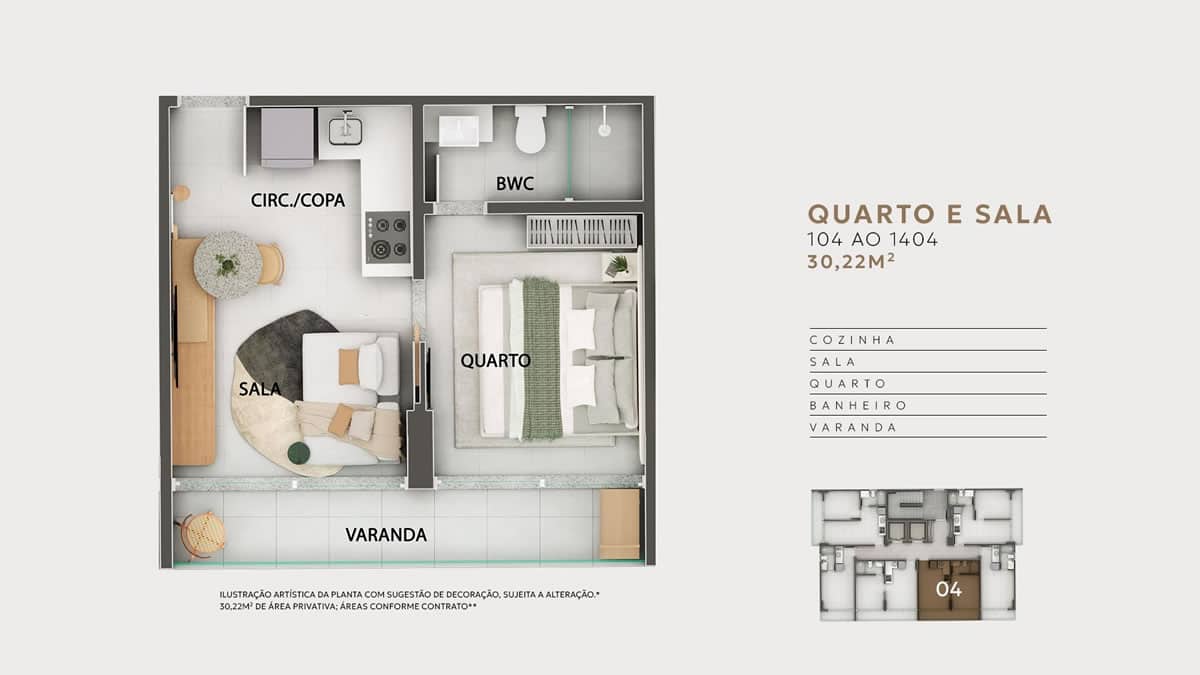 Planta do apartamento quarto e sala da coluna 04 do Mirantte, com 30,22 m², oferecendo conforto em um design compacto e bem distribuído.