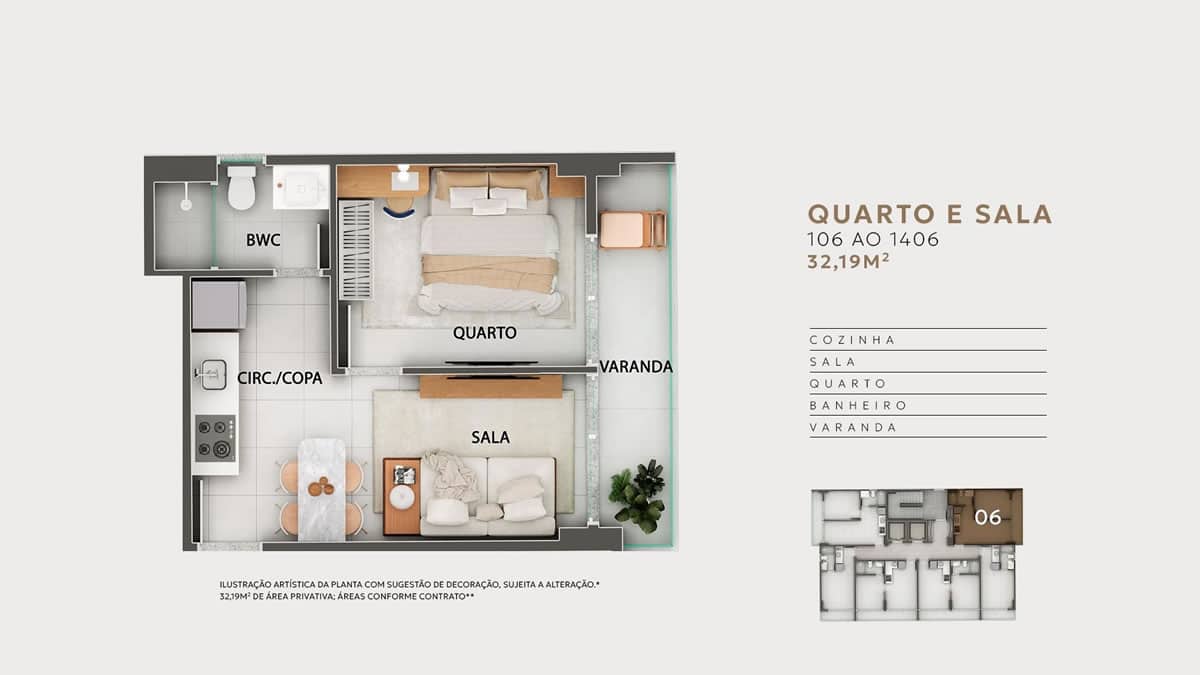 Planta do apartamento quarto e sala da coluna 06 do Mirantte, com 32,19 m², projetado para oferecer conforto e funcionalidade em um espaço otimizado.