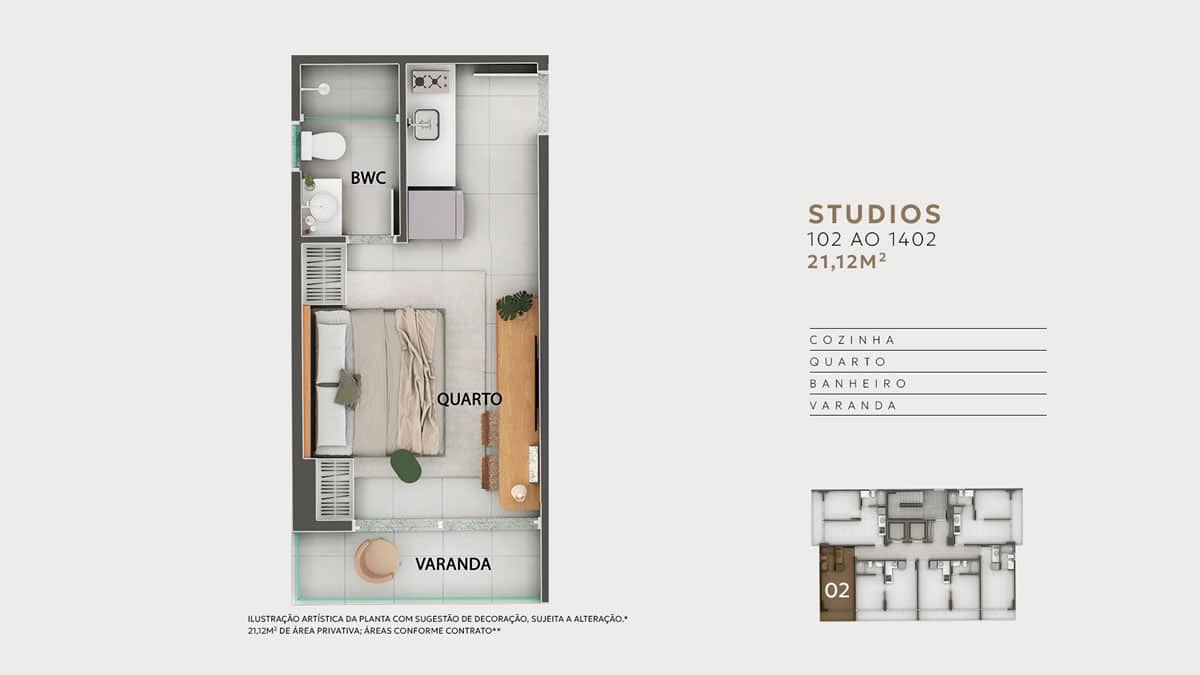 Planta do Studio da coluna 02 do Mirantte, com 21,12 m², um espaço compacto e bem distribuído para quem busca praticidade e conforto.