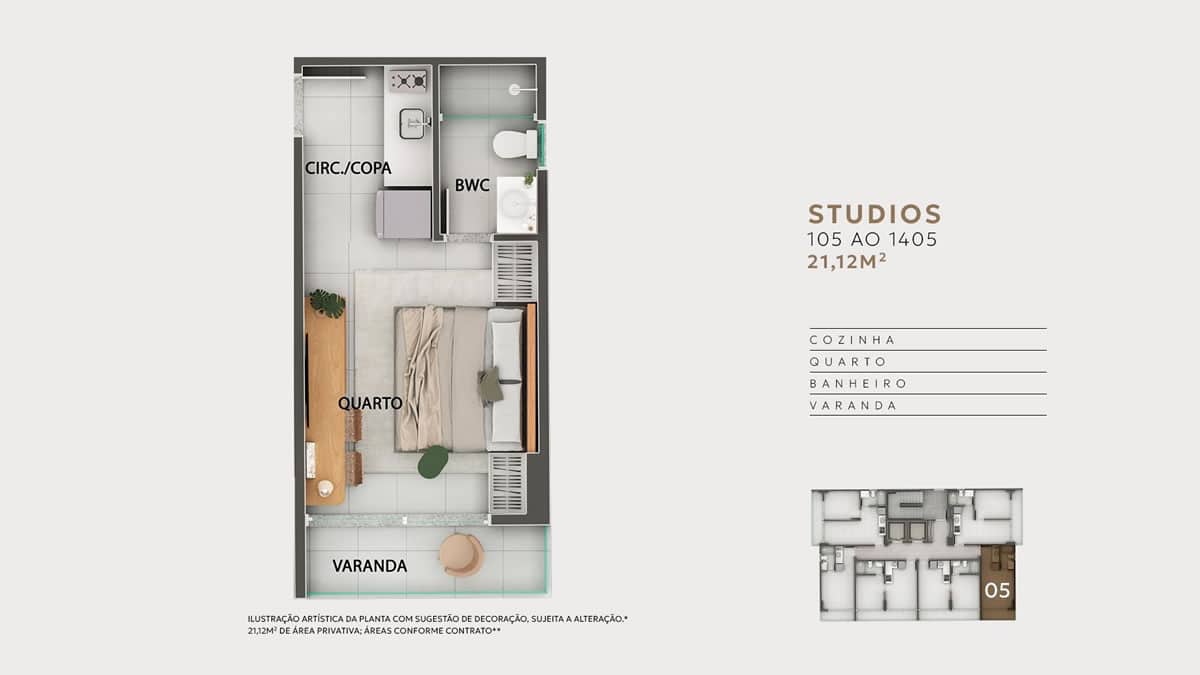 Planta do Studio da coluna 05 do Mirantte, com 21,12 m², apresentando uma organização prática e eficiente dos ambientes.
