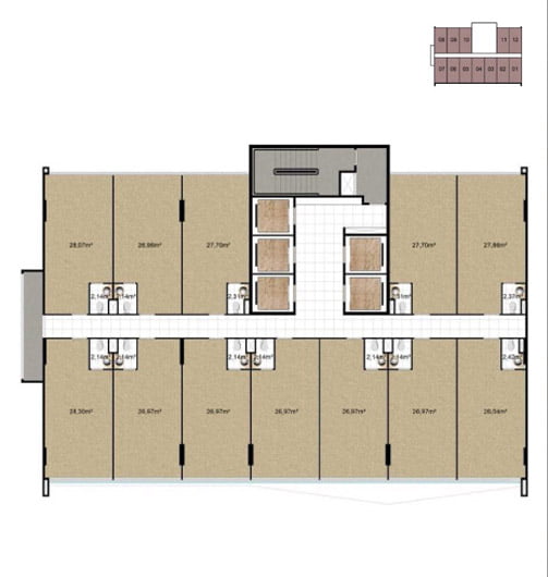 Planta single – padrão – final 3 – do 3º ao 13º e 16º andar | 29,11m² |