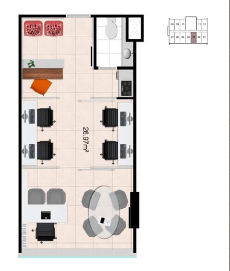Planta single – opção com cop a – final 3 – do 3º ao 13º e 16º andar | 29,11m² |