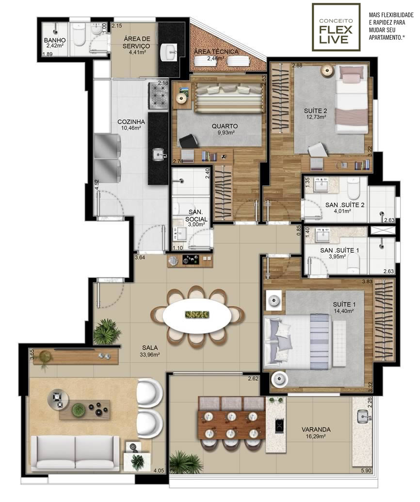 | Apartamento 1 quarto com suíte e varanda | 1 | 1 | — | 50,76m² |